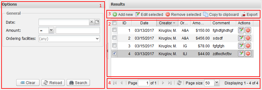 Add New: Create new payment entries with ease, specifying details such as Ordering facility, Date, Amount, and optional comments.